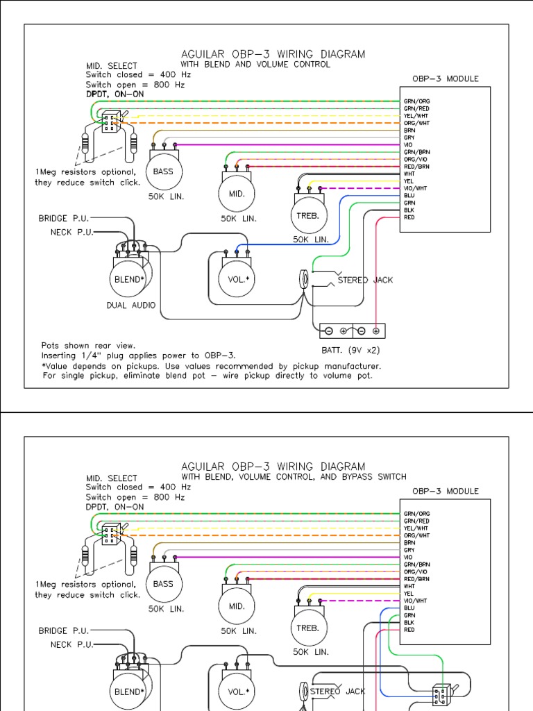 The OBP-3 has multiple wiring options and can be wired with either a mini-toggle or internal dip-switch for midrange frequency selection. B OK I only briefly looked at the circuit diagram and didnt trace out each wire completely. I received an Aguilar obp-3 for Christmas and Im trying to find the wiring diagram for the real version of the which has 1 volume1 blend 2 tone pots and mini switches for the seriesparallel.